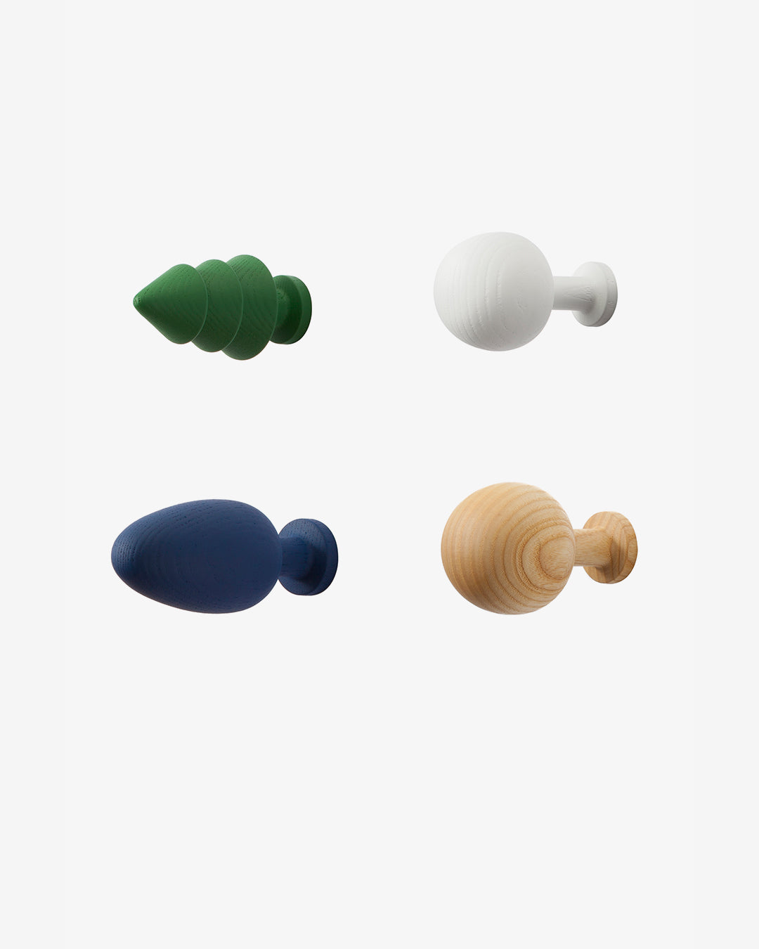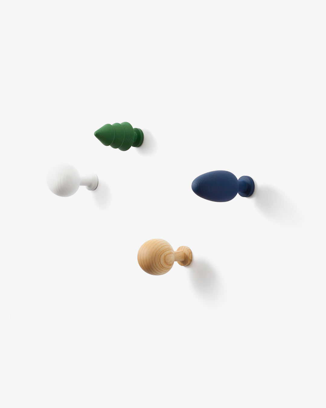 Forest 掛鉤以手工車製的白蠟木打造,共有四種不同造型,像是在牆面上長出的奇幻森林,勾勒出充滿玩趣的微小風景。提供自然木色與上漆兩種版本,簡單卻能為日常空間帶來細膩層次。安裝:內附五金鎖件與塑膠壁虎,安裝時需要使用電鑽鑽牆施工。