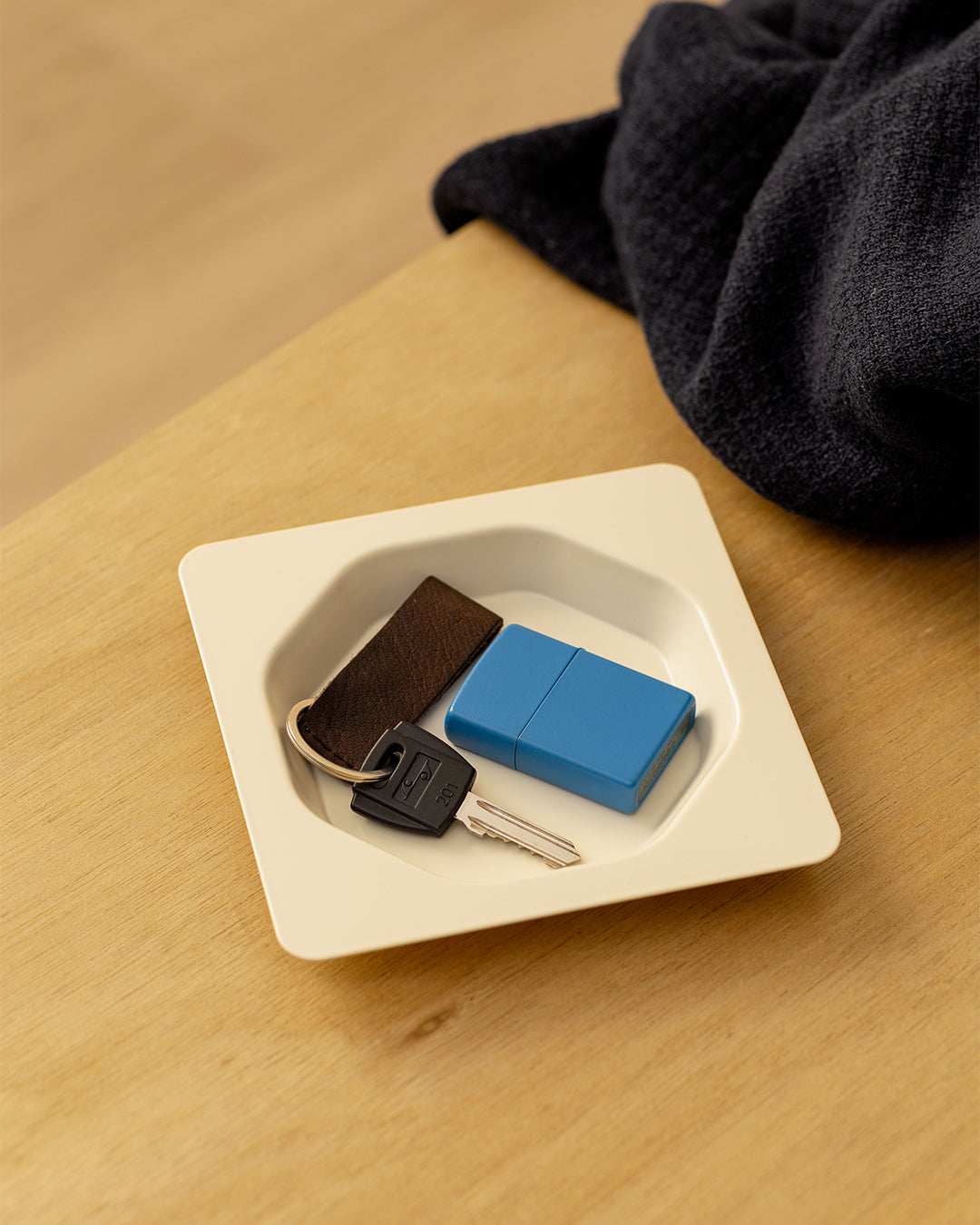 托盤提供三種尺寸與三種顏色,可單獨使用,也能由小至大層層堆疊,依照不同需求自由組合。它能輕鬆放置於書桌、廚房或床邊,讓零散物件有序安放,同時也替生活場景增添一份隨性又俐落的設計感。